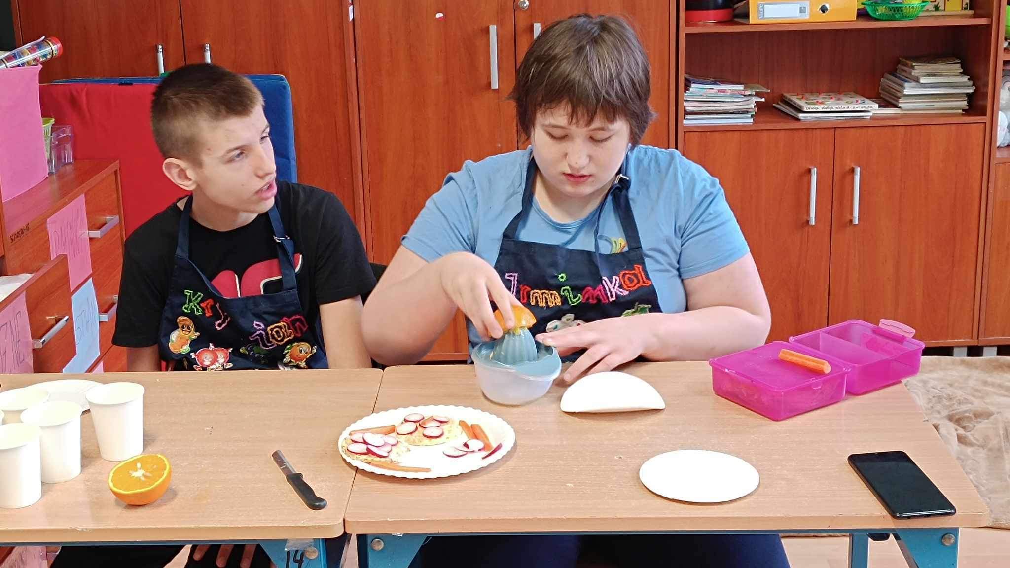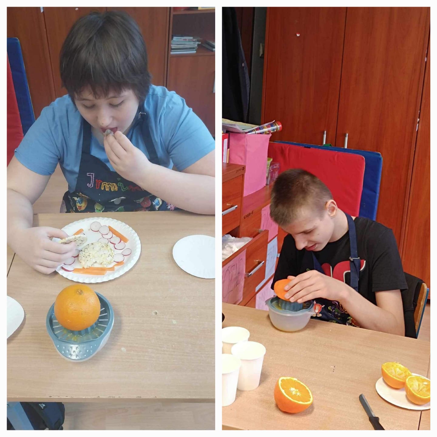 W ramach programu Szkoła Promująca Zdrowie klasa I-III PdP p. Basi zaprosiła uczniów z sąsiednich klas ZRW do wspólnego wykonania „Jesiennej surówki”. Uczniowie wszystkimi zmysłami poznawali składniki surówki, obierali, ucierali marchewki i jabłuszka, wyciskali sok z pomarańczy, doprawiali do smaku i mieszali składniki surówki. Uczyli się też obsługi robota kuchennego. Efekt był wyśmienity – wszystkie dzieci z apetytem zajadały smaczną i zdrową surówkę.
